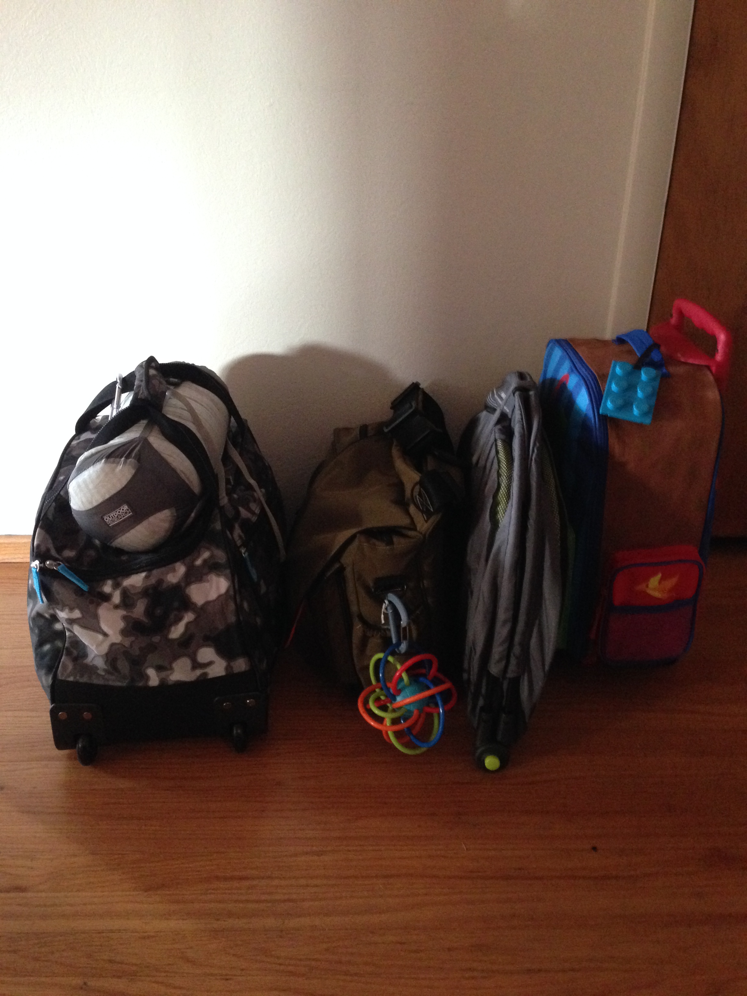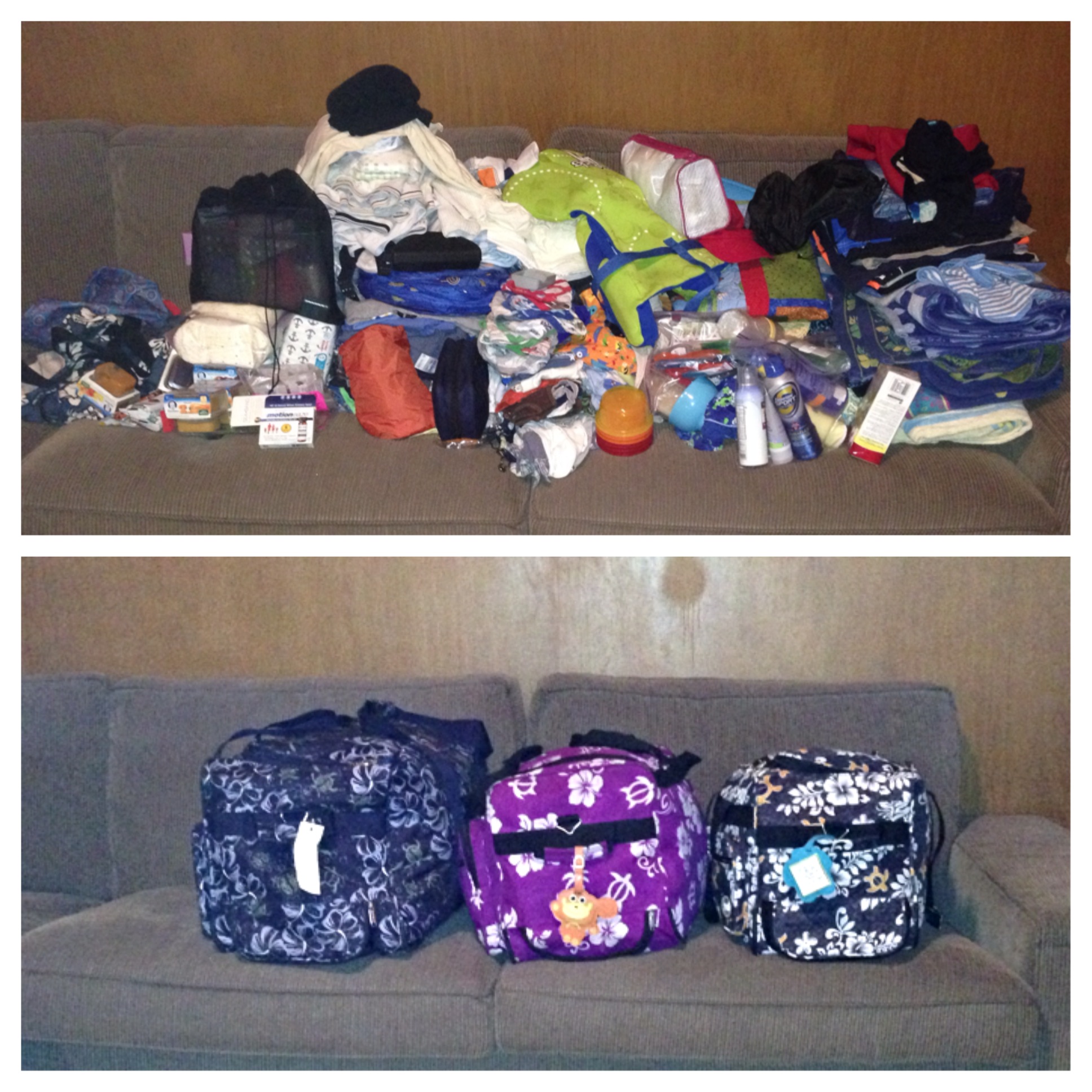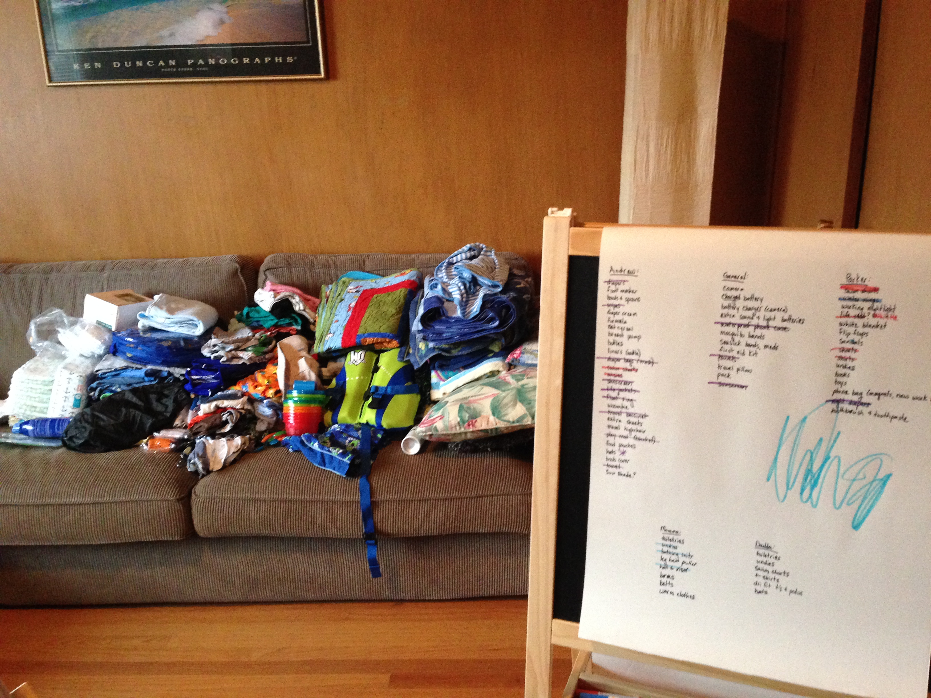 Making a list: With the details all worked out, next came the actual packing. If you read my other post, you know I am the queen of forgetting something important. I aimed to minimize that this trip. There are small convenience stores on some of the beaches, but not much in the way of groceries stores, and definitely no Targets, so it was very important to bring any essentials. I realized if an item makes the list it gets packed, so I tried something new this time – I confiscated my 4 year old’s easel and made BIG lists, DAYS before. That way as I thought of things I could just go add them to the list (I was barely functioning on very little sleep during this time), plus it kept all those lists out of my head. Then starting a week before, I started bringing items to be packed into one central spot and made one HUGE pile. If it made the pile, I crossed it off. As it got closer, I used a new sheet of easel paper taped to the wall to make a list of each of the carry-on bags we would be carrying and what would go in each (keep in mind, the night at the layover airport we would not have our checked bags). The lists probably would have made some people go insane – for me it allowed it all to be on paper and not in my head.