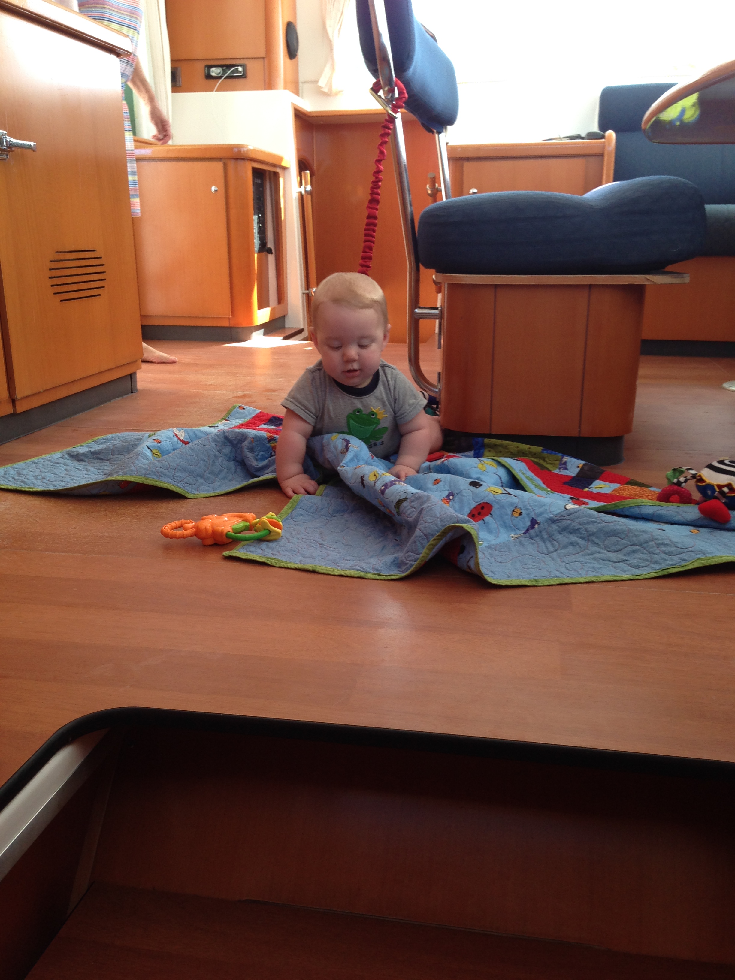 Safety: We were assured by the boat rental company they had life jackets for infant – adult. Our 4 year old weighed in at just over 50lbs right before we left, which means he fit into a youth life jacket, so we opted not to bring an extra one for him, but did bring his water wings. Our 6 month old clearly needed an infant jacket and we decided to bring ours just as back up in case we didn’t like theirs, since his was so critical. It turns out they did not have infant jackets and we were sure glad we brought ours! We brought a first aid kit and an assortment of essential medications, including some for the boys. My Dad brought a tether, which came in handy to keep the little mobile one from tumbling down the stairs to the cabins. Immediately after arriving at the boat, we all sat down together and discussed the rules of the boat concerning the boys so everyone was on the same page as to when life jackets had to be worn, when the 4 year old was and was not allowed to go, etc.